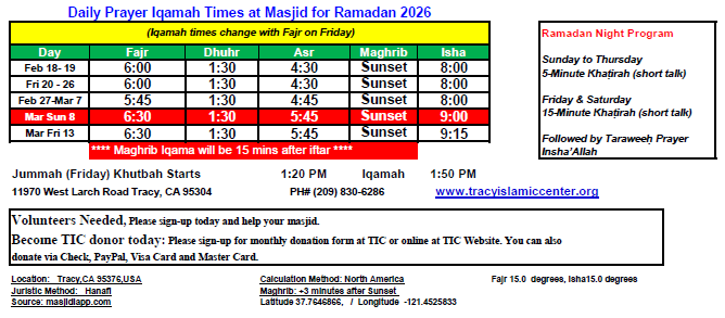 Tracy Islamic Center (T.I.C.) a 501(c)(3) non-profit religious organization serving as a Regional Islamic Center providing religious, educational and social services to the Muslim communities of Tracy, Mountain House, Lathrop and surrounding areas in San Joaquin County, California, USA.